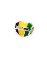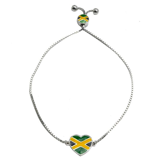Keep Jamaica close to your heart with this one. The heart shaped sterling silver bolo bracelet is adorned with black, green and yellow enamel resembling the Jamaican Flag.